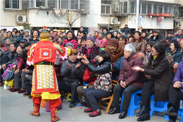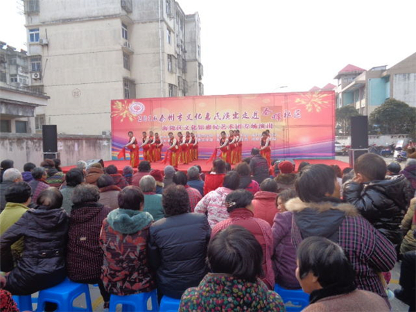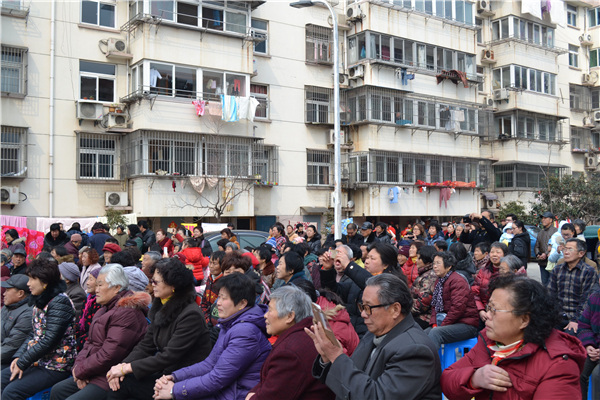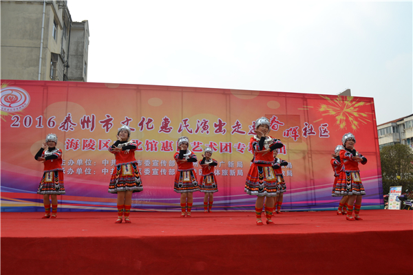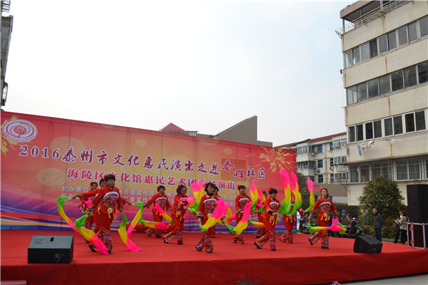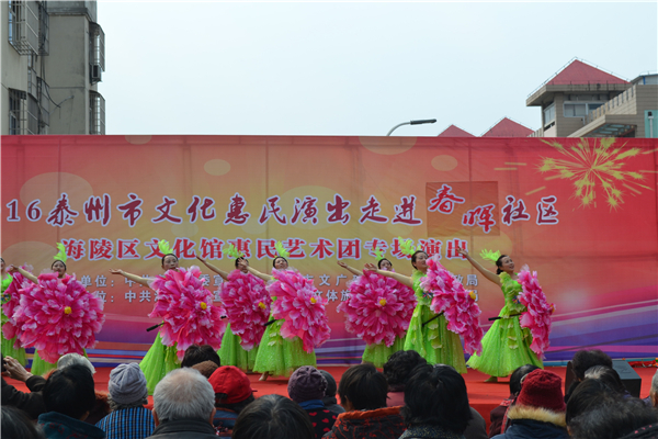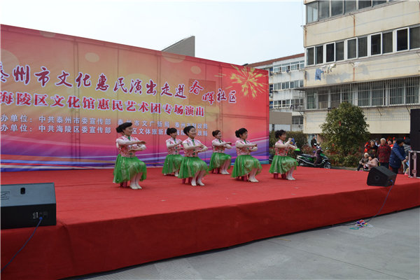 为了迎接这场文化盛宴的到来,当天下午社区居民早早聚集在社区广场上。演出首先以舞蹈《走进春天》拉开了帷幕,小品《老两口的中国梦》、魔术《美猴王》等节目将演出推向高潮,最后又以舞蹈《泰州号子舞》结束演出。